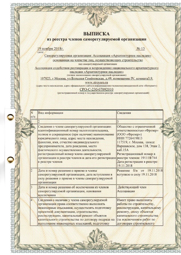 Поскольку компания Фрозер осуществляет поставки под ключ, поэтому компания имеет все необходимые лицензия для осуществления ген.подрядных, монтажных, пуско-наладочных работ на Вашем объекте.